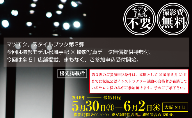 本年度第3弾におきましては、私共、松風がご参加頂くサロン様51店舗全ての撮影モデルをご用意致します。また、参加費:無料を継続致します。まもなく、公式サイトにてご参加申込フォームを公開致しますので、ご多忙とは存じますが、何卒、ご協力賜りますようお願い申し上げます。
