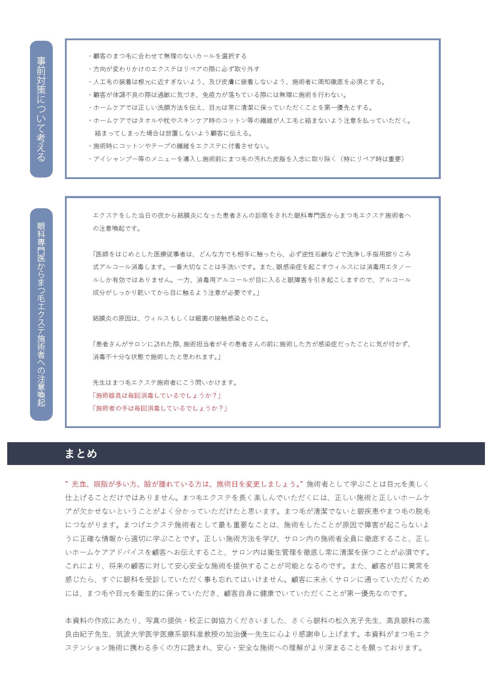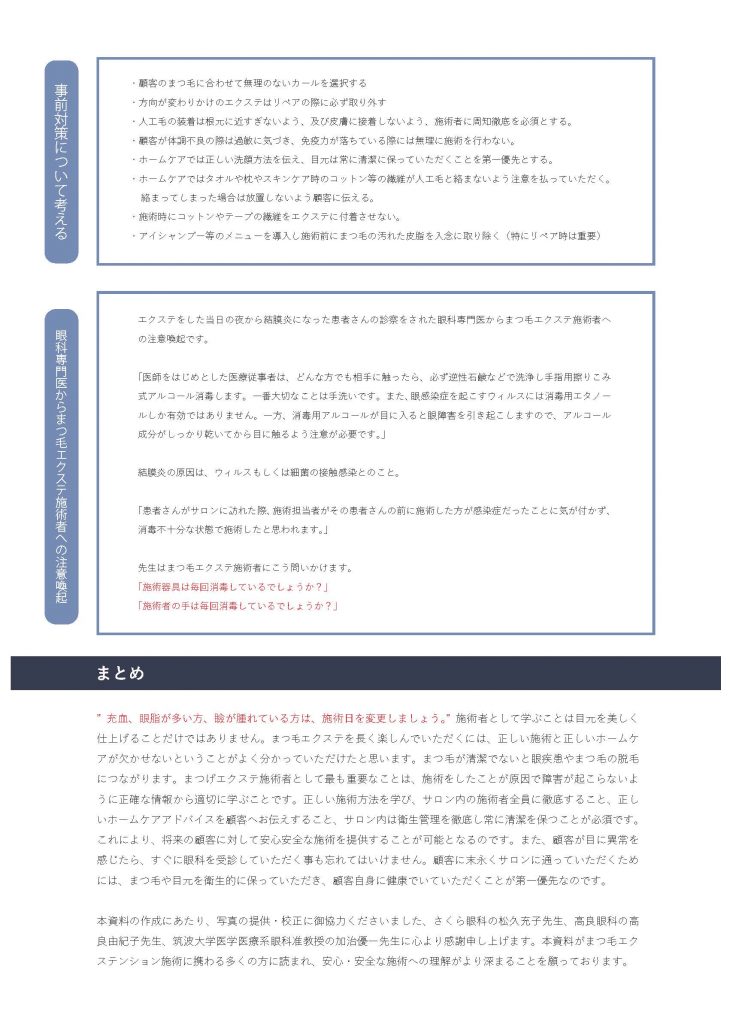 お客様に末永くサロンに通っていただくには、まつ毛や目元を衛生的に保っていただき、お客様自身に健康でいていただくことが第一優先です。本資料がまつ毛エクステンション施術に携わる多くの方々に読まれ、安心・安全な施術への理解がより深まることを願っております。