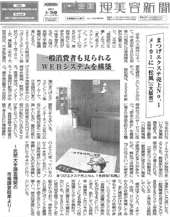 既にご高覧の機会を持たれた方もいらっしゃるのではと存じますが、最新号の全国理美容新聞紙上において弊社松風を「まつげエクステ売上げNo1メーカー」と認定いただく内容の記事が掲載されました。