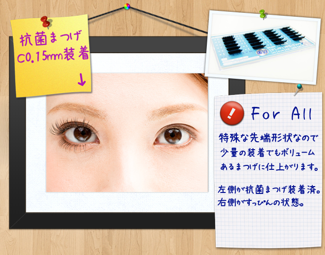 抗菌まつげエクステが他のエクステを決定的に異なるのは、装着した後も継続的に雑菌の繁殖を抑制することですが(目元を清潔に保つことはとても重要なことです)、抗菌まつげは「エアーラッシュライト」と同じく特殊な先端形状(毛先の細さ)をしています。